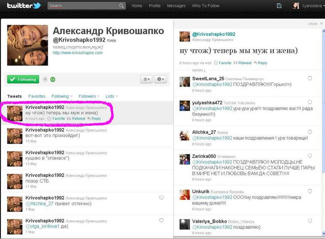 Александр Кривошапко, будоражащий умы не только малолеток, но и женщин с уже состоявшимся мировоззрением, шокировал в своем Твиттере новостью о своей свадьбе.