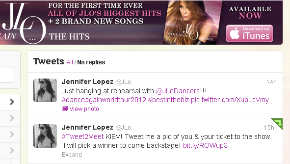 После поселения в киевский отель Дженнифер Лопес в своем Твиттере объявила о том, что будет просматривать все фотографии своих поклонников с их билетами, а после выберет человека, который попадет за кулисы киевского концерта, который состоится уже сегодня вечером во Дворце Спорта.