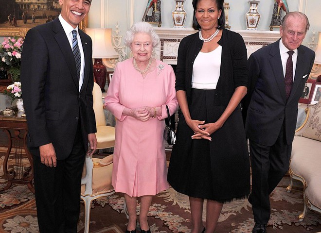 Видимо, привыкнув к лояльному дресс-коду Белого Дома, Мишель решила не заморачиваться по поводу этикета визита к британской королеве Елизавете II. Для приема она выбрала белый свитерок, на который сверху накинула черный кардиган — вполне уместный наряд для офиса, но никак не для такого случая!