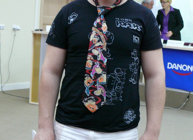 Сколько потратил на этот галстук, молодой исполнитель так и не признался, но зато приобретенный гламурненький аксессуар он смело комбинирует с вещицами своего гардероба.