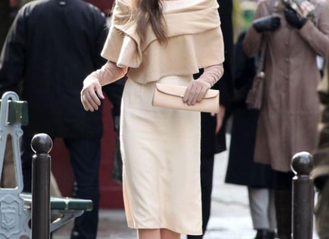 На зйомках нової стрічки, яка ще до виходу на екрани, обіцяє стати чи не найпопулярнішою, актриса з'явилася в елегантному світло бежевому костюмі. Крім того, стилісти підібрали для красуні аксесуари в тон. Такий стиль дуже личить голлівудської знаменитості.