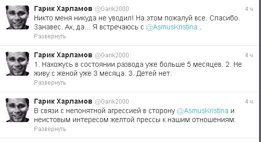 «У зв'язку з незрозумілою агресією в бік @AsmusKristina і шаленим інтересом жовтої преси до наших стосунків: