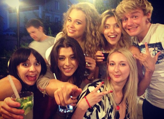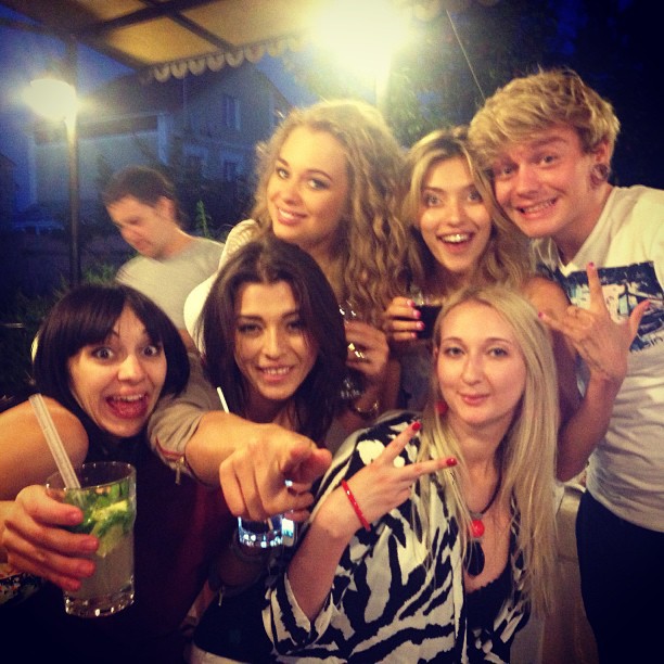 Олександр Кривошапко продовжує розповідати своїм читачам про те, як і з ким він любить проводити вільний від зйомок час. Вчора співак поділився фотографією того, як зустрів дівчат з групи «Real O» в одному з київських закладів.