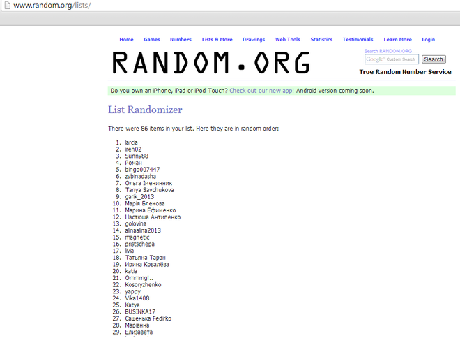 Переможці визначатимуться за допомогою програми random.org