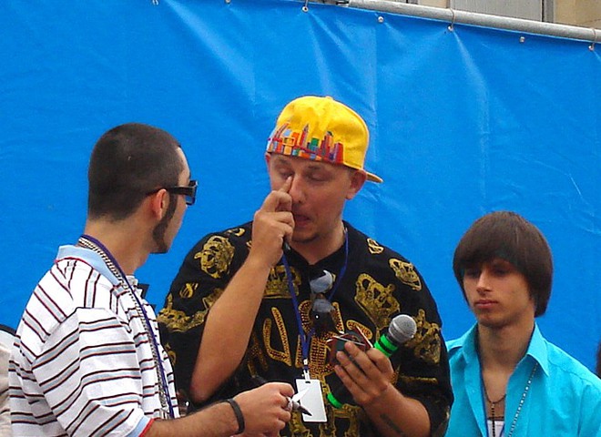 Буквально за хвилину Потап, помітивши приціл фотокамери, став у робочу гламурну позу й «натяг» усмішку на обличчя.